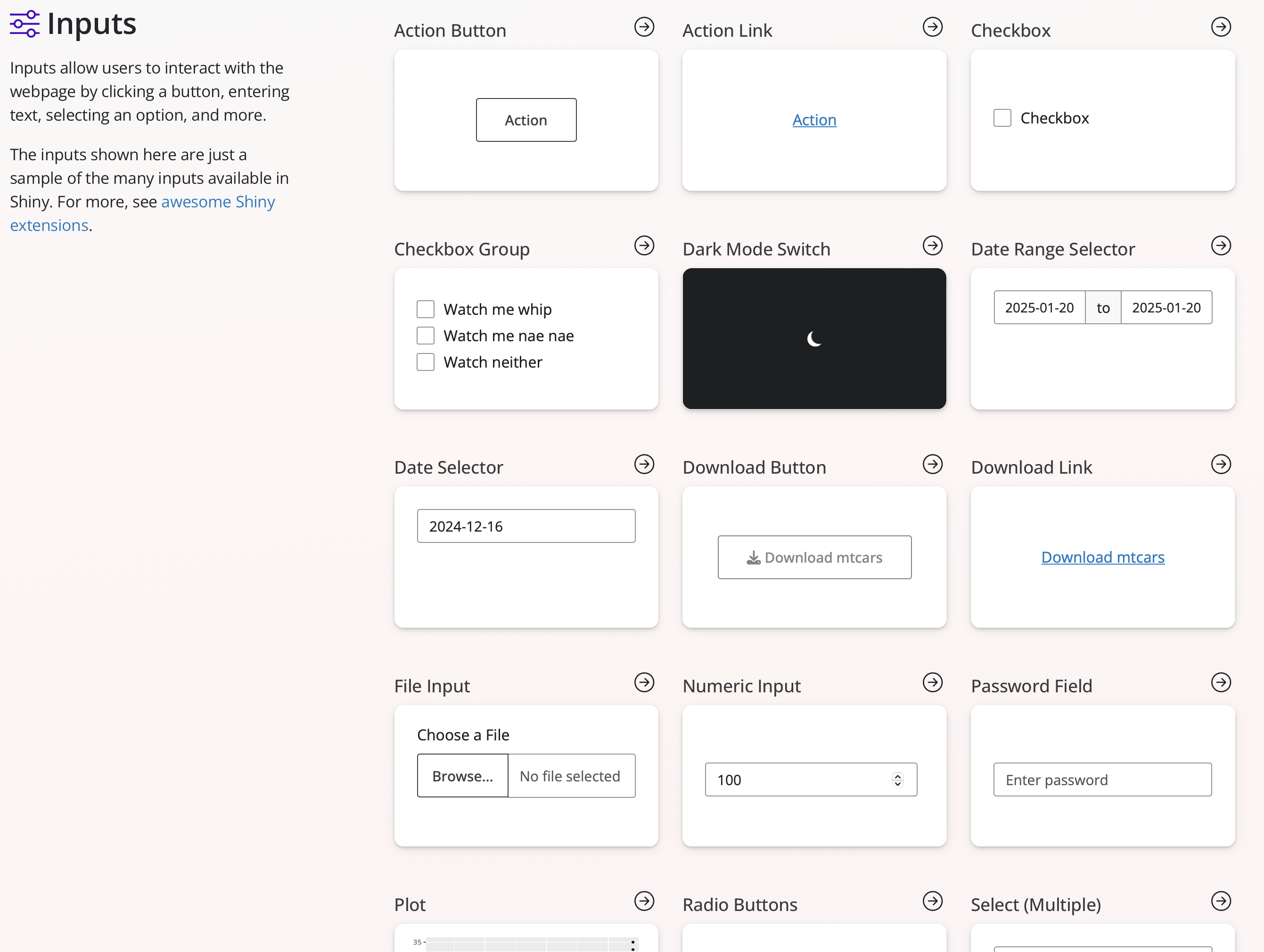 Additional info on Shiny inputs can be found from the Shiny for R tutorial and the Shiny components page.