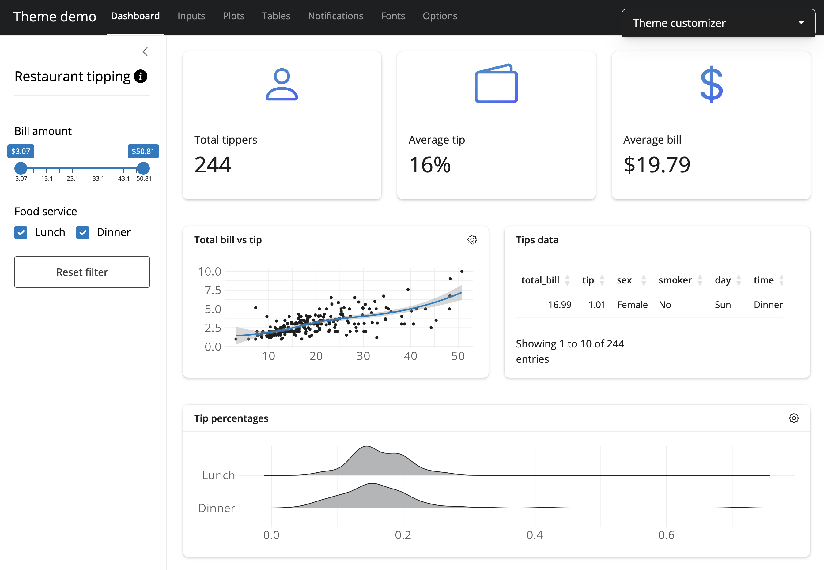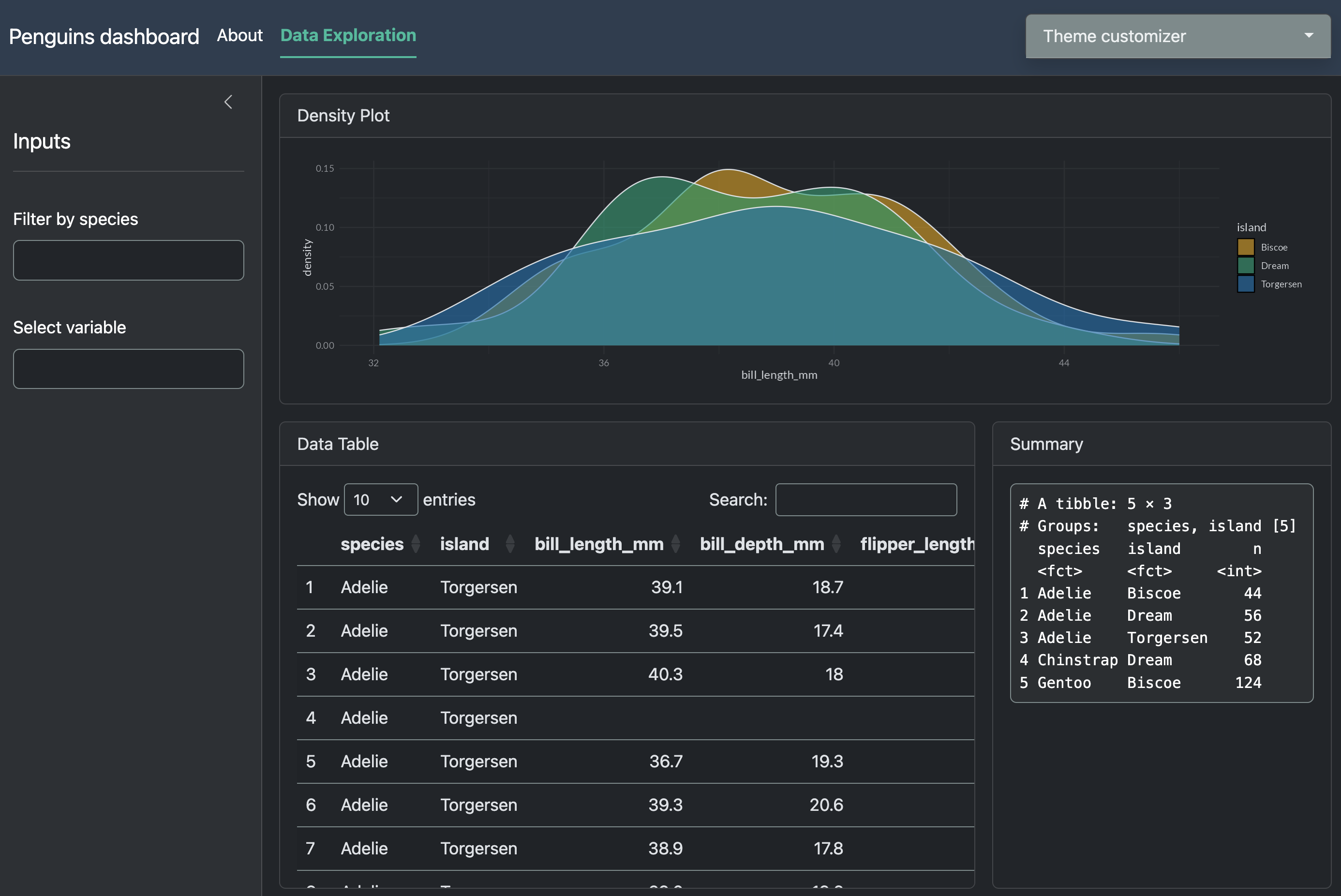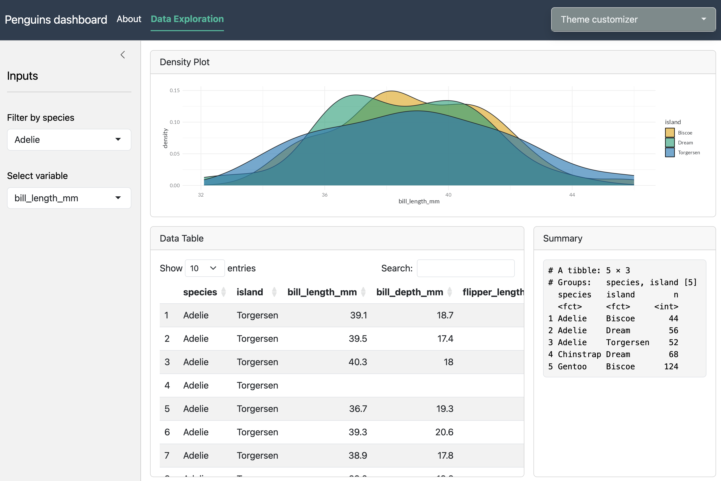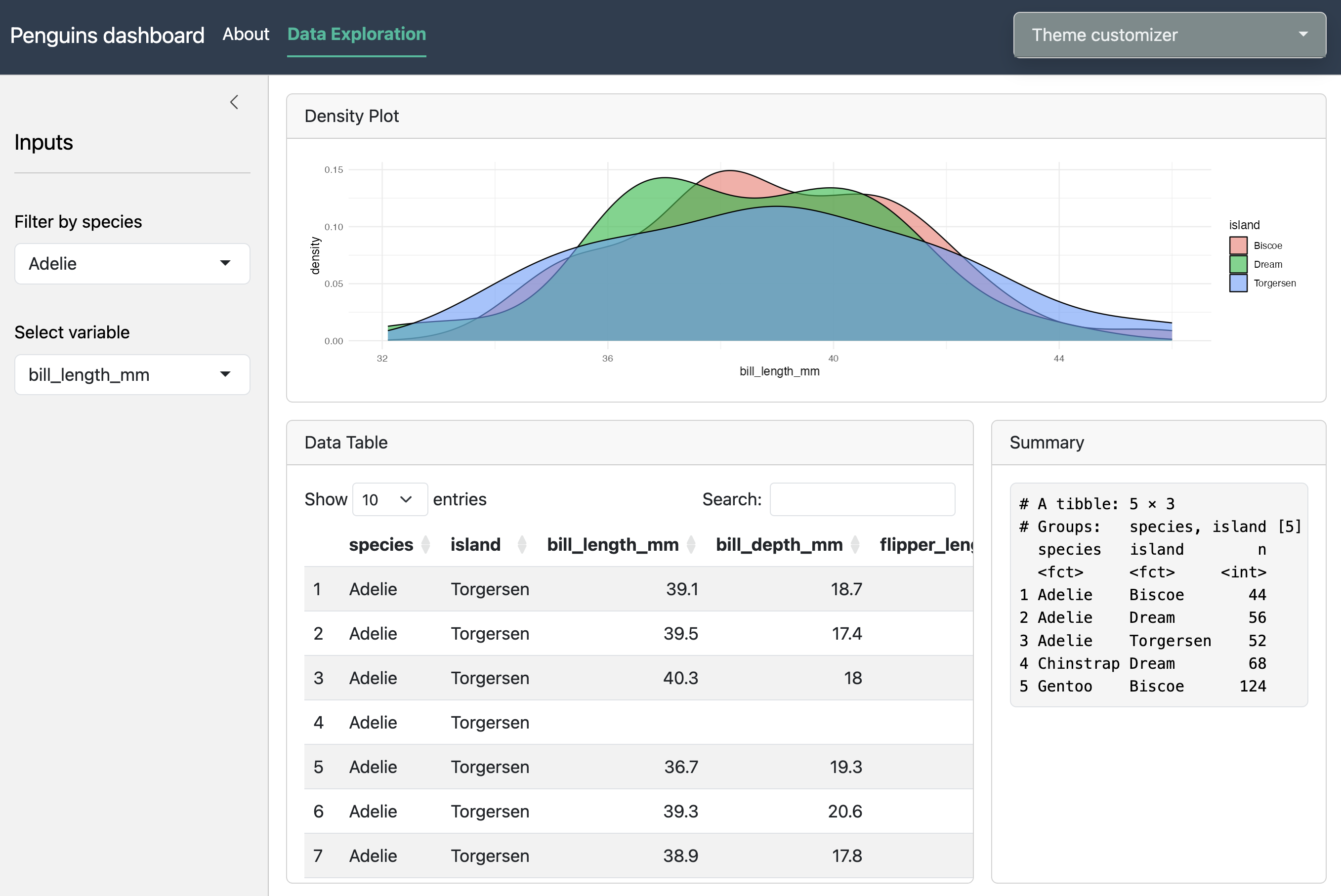 These themes can be explored using a built-in Shiny app from {bslib} using the bs_theme_preview() function, which includes a dropdown panel for customizing different aesthetics for the app. Additionally, these themes can be dynamically explored for your own Shiny app by adding bs_themer() to the server component of your app: